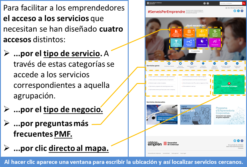 El web #ServeisPerEmprendre (Servicios para Emprender), promovido por Catalunya Emprèn de la Generalitat de Catalunya, reúne programas, servicios y actividades que prestan tanto entidades públicas como privadas en el territorio catalán, en una plataforma única consultable con la finalidad de ofrecérselos a todas las personas emprendedoras. Es una herramienta que proporciona la máxima visibilidad y notoriedad a las entidades y a sus servicios.